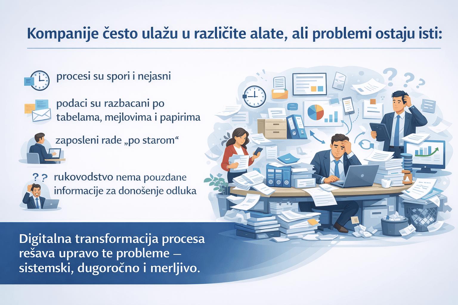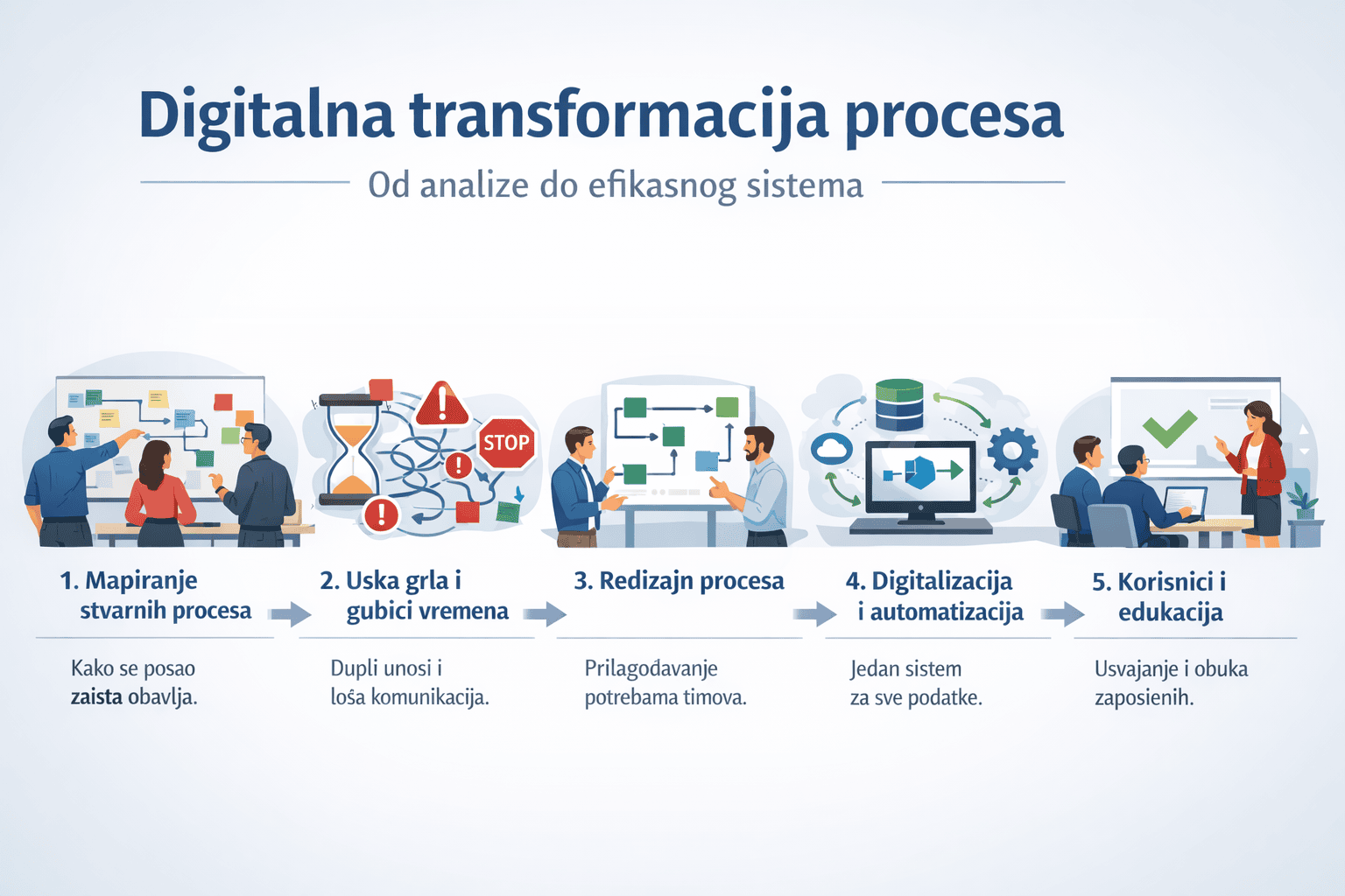 Digitalna transformacija procesa rešava upravo te probleme – sistemski, dugoročno i merljivo.